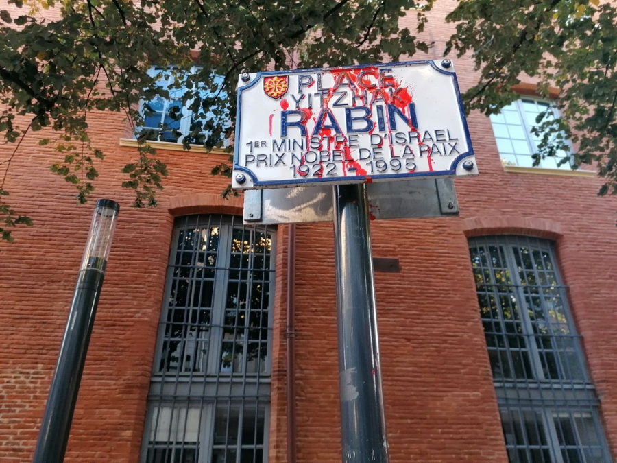 ناشطون فرنسيون يطلون يافطة ميدان "يتسحاق رابين" وسط تولوز باللون الأحمر احتجاجًا على جرائم الكيان الصهيوني